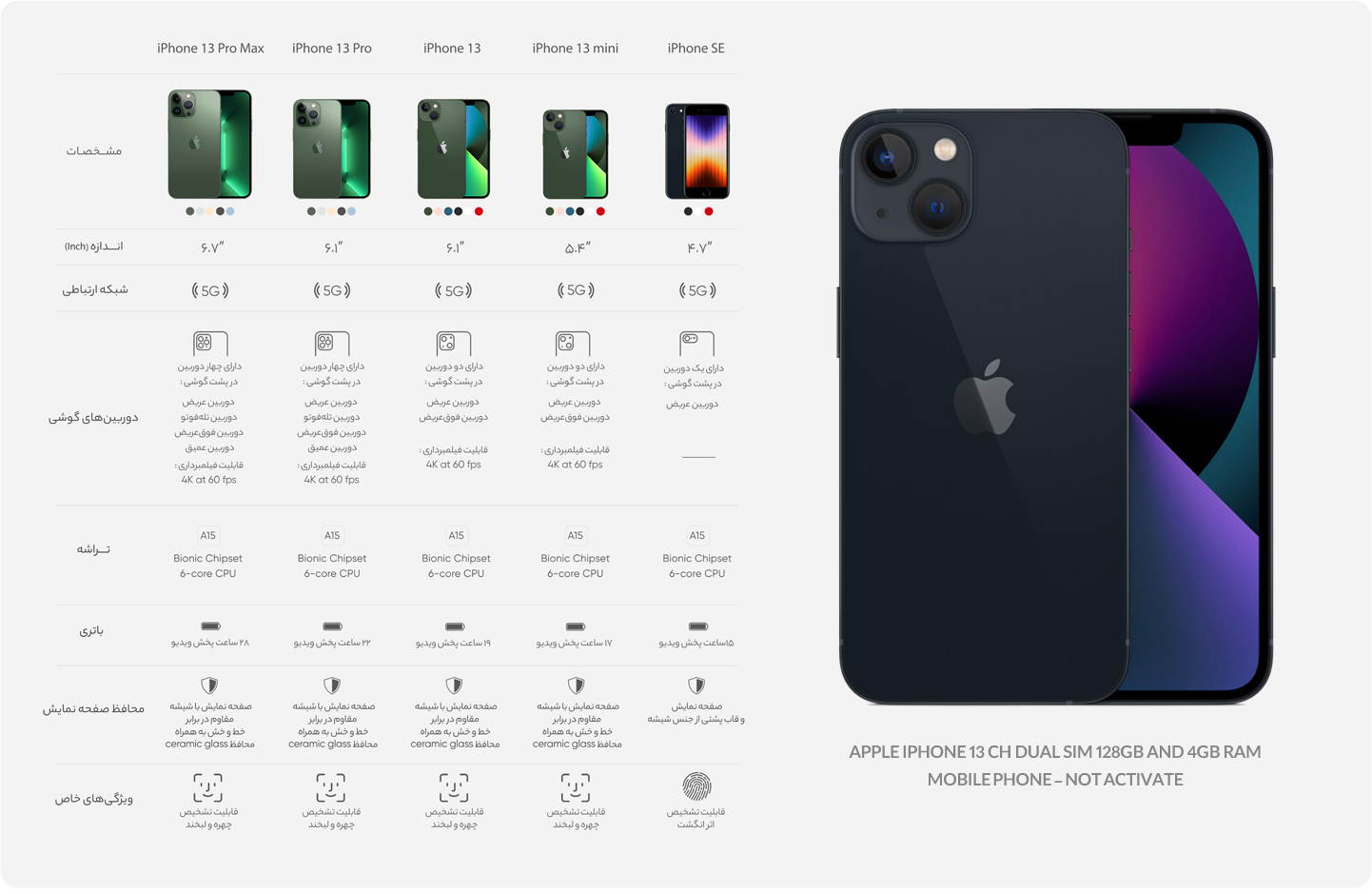 گوشی موبایل iPhone 13 CH پرچم‌دار جدید شرکت اپل است که با چند ویژگی جدید و دوربین دوگانه روانه بازار شده است. نمایشگر آیفون 13 به پنل Super Retina مجهز ‌شده است تا تصاویر بسیار مطلوبی را به کاربر عرضه کند. این نمایشگر رزولوشن بسیار بالایی دارد؛ به‌طوری‌که در اندازه­‌ی 6.1 اینچی‌اش، حدود 460 پیکسل را در هر اینچ جا داده است. امکان شارژ بی‌‌سیم باتری در این گوشی وجود دارد. تشخیص چهره با استفاده از دوربین جلو دیگر ویژگی است که در آیفون جدید اپل به کار گرفته شده است. از نظر سخت‌‌افزاری این گوشی از تراشه­‌ی جدید A15 بهره می‌برد که دارای 15 میلیارد ترانزیستور است که دارای کنترل گرمای مطلوبی بوده که تا بتواند علاوه بر کارهای معمول، از قابلیت‌های جدید واقعیت مجازی که اپل این روزها روی آن تمرکز خاصی دارد، پشتیبانی کند. به گفته خود شرکت اپل این گوشی دارای سرعتی 50 برابر نسخه 12 خود است. پردازنده دارای ماژولار جدیدی است که مصرف باتری را بسیار پایین‌تر آورده است و شما دارای حفظ باتری بالاتری هستید. کیفیت نمایش شما در iPhone 13 دارای 120 هرتز است و کیفیت بالایی را شاهد خواهید بود. اپل در این سری از گوشی‌های iPhone خود پردازنده گرافیکی‌ای را قرار داده که از سری 12 گوشی‌های خود 30 درصد سریع‌تر است و این نویدبخش آن است که شما می‌توانید بازی‌هایی را با گرافیک و MAP سنگین تر و بزرگ‌تر اجرا کنید. یکی از ویژگی‌هایی که در iPhone 13 شاهد هستیم سیستم فیلمبرداری ProRes سینمایی آن است که می تواند انقلابی در فیلمبرداری گوشی‌های موبایل به‌راه انداخته باشد. گوشی‌های نات اکتیو با قرار گرفتن سیم‌کارت‌های داخلی اکتیو می‌شوند و برخلاف مدل اکتیو پلمپ کالا باز نشده است. گوشی‌های اکتیو برند اپل هم به این شکل هستند که به دلیل محدودیت‌های برخی از محصولات اپل برای کشور ایران، در کشور‌های همسایه به‌صورت رسمی با یک بار قرار گرفتن سیم‌کارت، اکتیو شده و پلمپ می‌شوند و باید بدانید که این پروسه هیچ مشکلی در راستای گارانتی کالا به‌همراه ندارد. پارت‌نامبر‌های اروپا و ژاپن و امارات تک سیم‌کارت هستند و پارت‌نامبر‌های مربوط به امارات هم از فیس تایم پشتیبانی نمی‌کنند. پارت‌نامبر JA (ژاپن) هم حتی در حالت سایلنت صدای شاتر عکس قطع نمی‌شود.